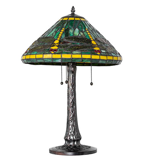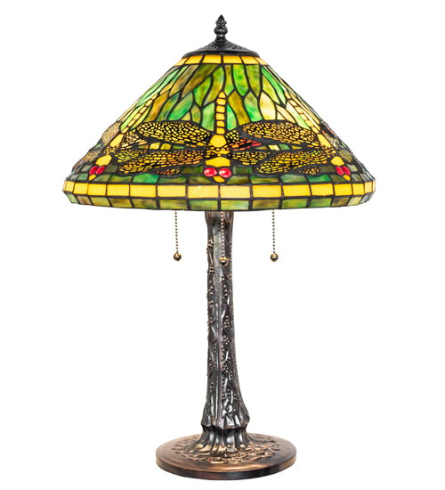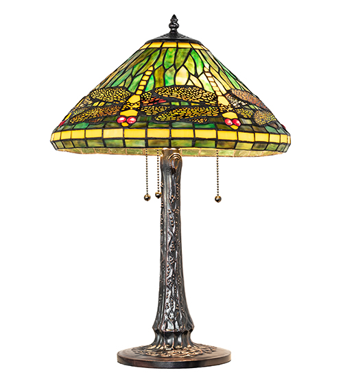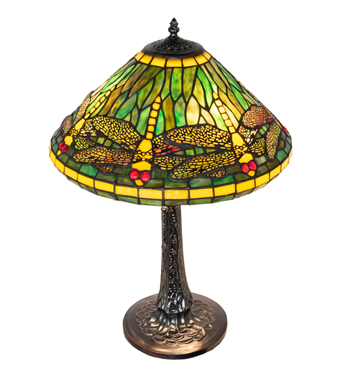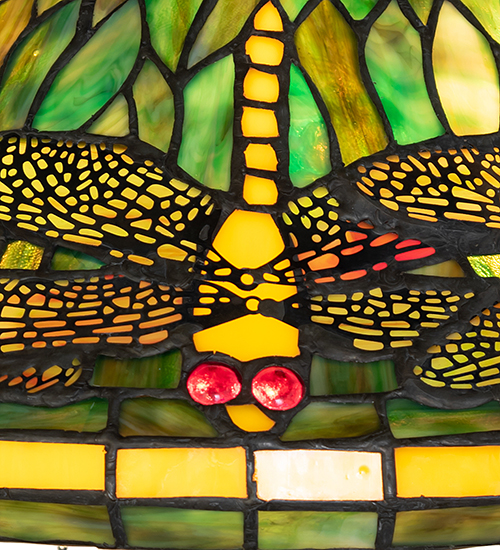 22″ High Tiffany Dragonfly Table Lamp – Classic Pond Green Art Glass with Scarlet Jewel Accents