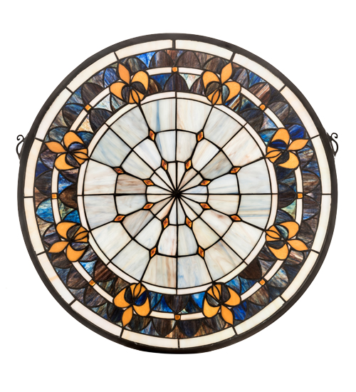 An original design, the Fleur-de-Lis medallion window is an intricate design of Golden tri-petaled irises and jewels against Twilight and Beige bands. Reminiscent of castle and cathedral windows, this pattern holds a prominent place in French Heraldry. Fleur-de-lis Medallion Stained Glass Window Handcrafted utilizing the copper foil construction process and 296 pieces of stained art glass and 24 Amber glass jewels encased in a solid brass frame. Mounting bracket and jack chain are included.