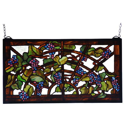 Tiffany Grape Arbor Stained Glass Window. Radiant Concord Purple jewels with Vineyard Green leaves and glistening dew kissed Bark Brown vines on a Golden arbor accent a Crystalline glass background. 490 pieces of hand cut stained glass, bring sunny vineyards into home with this lovely hand crafted Meyda Tiffany original window. A solid brass hanging bracket and chains are included.
